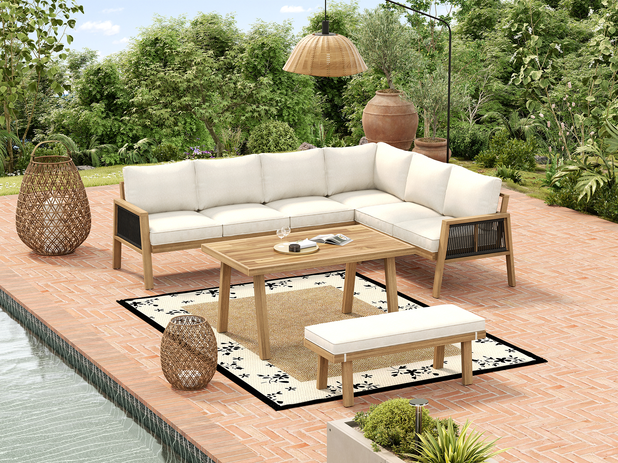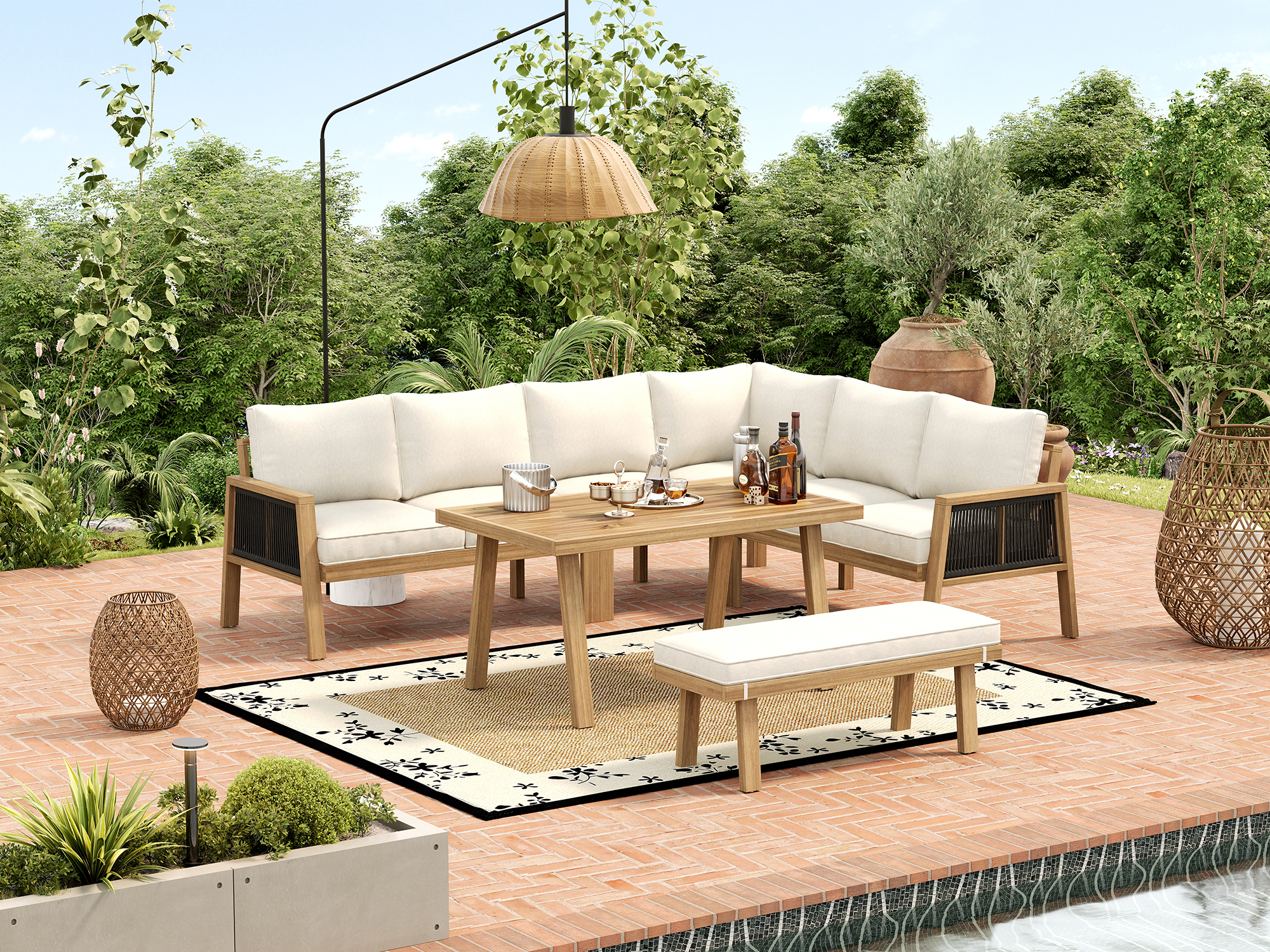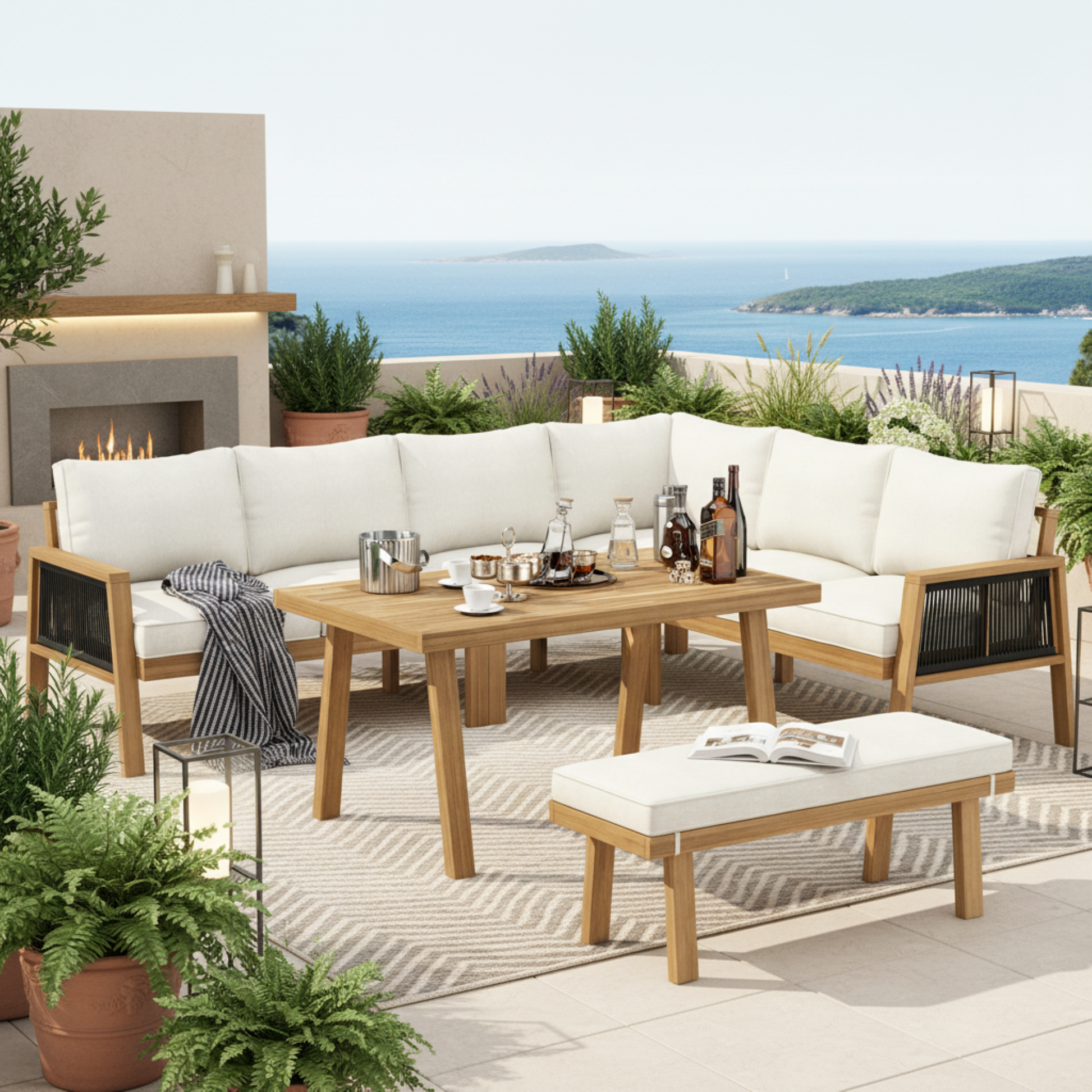 - 6-7 Seater Corner Sofa & Bench Layout – The smart combination of a corner sofa and bench comfortably seats up to 6-7 people, creating the perfect layout for lively outdoor gatherings, family meals, or relaxed afternoons with friends.