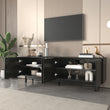 This elegant black TV cabinet impresses with an outstanding combination of modern design and practical functionality. Measuring 175 cm x 38 cm x 56 cm, it offers a generous storage solution for multimedia devices, books, and other items. The four uniquely textured doors, which open without handles using the push-to-open mechanism, emphasize the minimalist and luxurious appearance. Behind each door is a storage space with an adjustable shelf that can be flexibly adapted to your needs. This ensures neat organization and makes the TV cabinet a versatile choice for modern living spaces. The sturdy black wooden legs provide stability and harmonize perfectly with the rest of the design. Made of high-quality wood and equipped with premium fittings, this TV cabinet offers durability and stability. The thoughtful design not only allows for a tidy look but also adds a touch of elegance to your living room. The black finish makes it a timeless piece of furniture that blends seamlessly into any interior. An absolute must-have for anyone who wants to combine style, functionality, and quality in one piece of furniture.